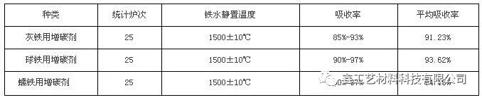 增碳剂越细小加入时与铁液的接触面积大,溶解快,容易吸收,但若粒度过于细小,易被氧化,损耗大;颗粒大,溶解速度慢,损耗较小,选择时根据熔炼炉的类型选择合适粒度的增碳剂。几种增碳剂吸收率对比