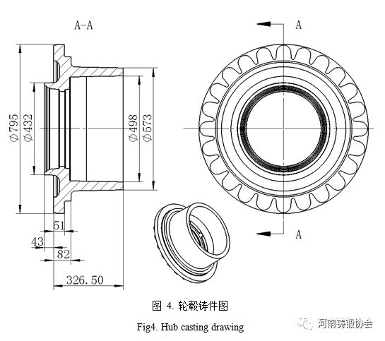 出口风电铸件,材质QT400-18AL,毛坯重量113kg,如下图3,铸件模数Mc=3.3cm,大于 2.5cm,1350℃以下的低温浇注,中频电炉熔炼铁水,精选炉料,铁水球化处理前还进行 预处理,呋喃树脂砂造型,满足资料[2] [3]所述的球墨铸铁件无冒口铸造的条件。在初期生产时铸件热节处设置外冷铁,在铸件顶部只设置 5mm×45mm的排气片,生产时经超声波探 伤(2 级)检查内部缩松废品率平均22%。经过工艺改进后,增加了补缩冒口,铸件超声波探伤缩松废品率<2%,铸件质量稳定。该铸件本身的几何条件和生产条件虽然满足资料[1] [2][3]所述的球墨铸铁件无冒口铸造的条件,但是由于铸件形状简单,铸件整个体积内同时糊状凝固和收缩,无法达到涨缩叠加,石墨析出膨胀力会从排气冒口释放掉而不能被有效的用于自补缩,在后期的收缩时如果没有冒口提供补缩,铸件就会产生缩松,所以该铸件必须设置补缩冒口。