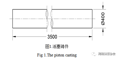 从直径 Ø300mm~Ø800mm是一个系列产品,材质QT500-7,所有的活塞形状就是一个 实心圆柱体,铸件的模数都大于2.5,如下图1所示的规格,铸件的毛坯就是一个直径Ø400mm高度3500mm的圆柱体,铸件重量3190kg,图示活塞模数Mc=9.46cm,全部用铸铁金属型铸造,低温浇注,无论铸件参数还是生产工艺条件都满足资料[2] [3]所述的球墨铸铁件无冒口铸造工艺条件,这些条件是:①铁水冶金质量好;②铸件平均模数Mc>2.5cm;③高强度、高刚度的铸型;④低温快浇;⑤扁平内浇道分散引入铁液;⑥设置明出气孔。开始试生产 时,认为铸件模数较大,Mc>2.5cm,金属型不仅是坚硬无退让性的铸型,而且冷却速度快,又是1350℃以下的低温浇注,由于铸件重要,原辅材料都是精选的,中频电炉熔炼铁水, 铁水球化处理前还进行预处理,完全达到无冒口铸造的条件,所以没有设置冒口。结果铸件上端内部产生缩松。后来给铸件上端设置大冒口,结果铸件内部没有缩松缺陷。所以, 这种产品的定型工艺都是上端设置大冒口。这个铸件形状较简单,高径比很大,按照传统的理论设计工艺不适宜。这样的铸件,不仅要用厚壁金属型,提高铁水冷却速度,还要用大冒口强力补缩,同时,铸件顶部完全是冒口,浇注时型腔内的渣子和气体可以充分排出到冒口之中,从而保证了这种高技术要求铸件的质量。这个铸件的生产实践说明,厚壁大件即使满足传统理论所述的无冒口铸造条件,无冒口铸造工艺也不一定适用。铸件某一方向尺寸较大,铸件在凝固过程中即是同时发生收缩和膨胀,膨胀的作用不一定能够达到正在收缩而需要补缩的部位。石墨析出的膨胀力已经释放,后期凝固收缩时得不到其它部位的补缩,就需要靠冒口来提供补缩,否则,铸件内部就会产生收缩缺陷。