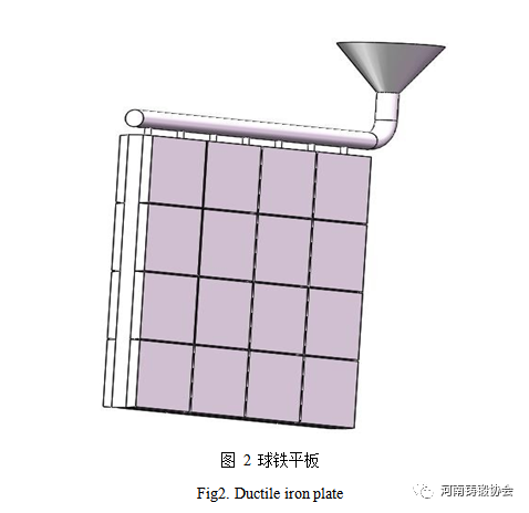 材质牌号QT550-5,尺寸长×宽×高=860mm×800mm×40mm,重量200kg,Mc=1.82cm, 不满足资料[2] [3]所述的球墨铸铁件无冒口铸造的条件,需要设置冒口。该铸件是一个非常重要的工程设备用备件,加工后需要进行100%射线探伤,实际生产时采用多种 冒口铸造工艺,水平浇注、倾斜浇注和竖立浇注,都无法达到该铸件的技术要求,射线探伤合格率<10%。在即将放弃的时候,决定采用无冒口铸造工艺再试一次,如下图2。该工艺的要点是:铸件两个大平面外侧全部用冷铁,竖立造型和浇注,顶雨淋浇口,无冒口,中温浇注。铸件加工后超声波检测和涉射线检测一次合格,力学性能也比以前的工艺好很多,实际生产中抗拉强度Rm>600MPa,屈服强度Rp0.2>380MPa,伸长率A%>5。这个铸件的工艺原理是:虽然铸件本身几何条件不满足无冒口铸造的条件,但是全部用外冷铁后就人为地创造了无冒口铸造的条件,铸型无退让性,冷铁厚度的激冷作用区可以达到铸件的中心部位,铸件表面和心部以及上下之间凝固时间略有差别但距离很近,相当于资料[4]所述的铸件结构上既有厚壁部位又有薄壁部位,可以实现膨胀和收缩的叠加和互补,即实现有效的均衡凝固;铸件顶部的雨淋浇口不仅可以起到液态补缩作用,同时在浇注过程中击打型腔内液面顶部,给渣子和气体上浮创了造条件,保证了铸件的质量。这个铸件的生产实践说明,铸件的模数即使不满足传统理论所述的球墨铸铁件无冒口铸造条件,设置冒口铸造工艺也不一定是最佳选择,相反,无冒口铸造工艺却能够得到质量最优的铸件产品。